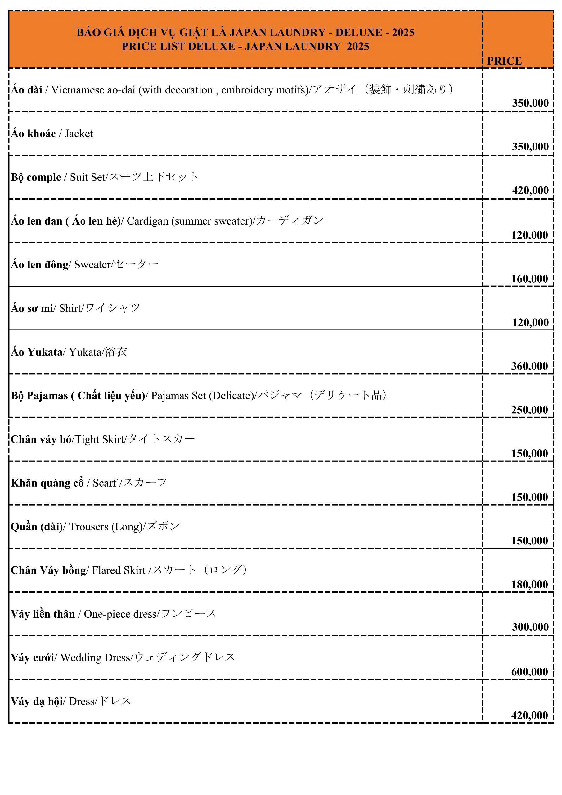 Chia sẻ nhiều hơn về bảng giá Deluxe của Japan Laundry.