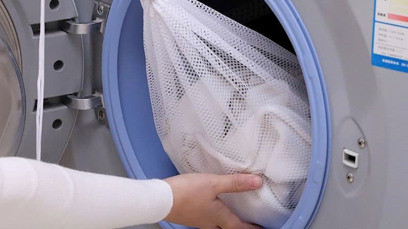 Áo vest sau khi đã lộn ngược lại thì bạn cuộn chặt từ dưới lên trên . Sau đó cho áo vào túi giặt chuyên dụng , cố định bằng chốt an toàn , rồi cho vào máy giặt . Một bước quan trọng để giảm thiểu tình trạng lồng giặt quá mạnh .