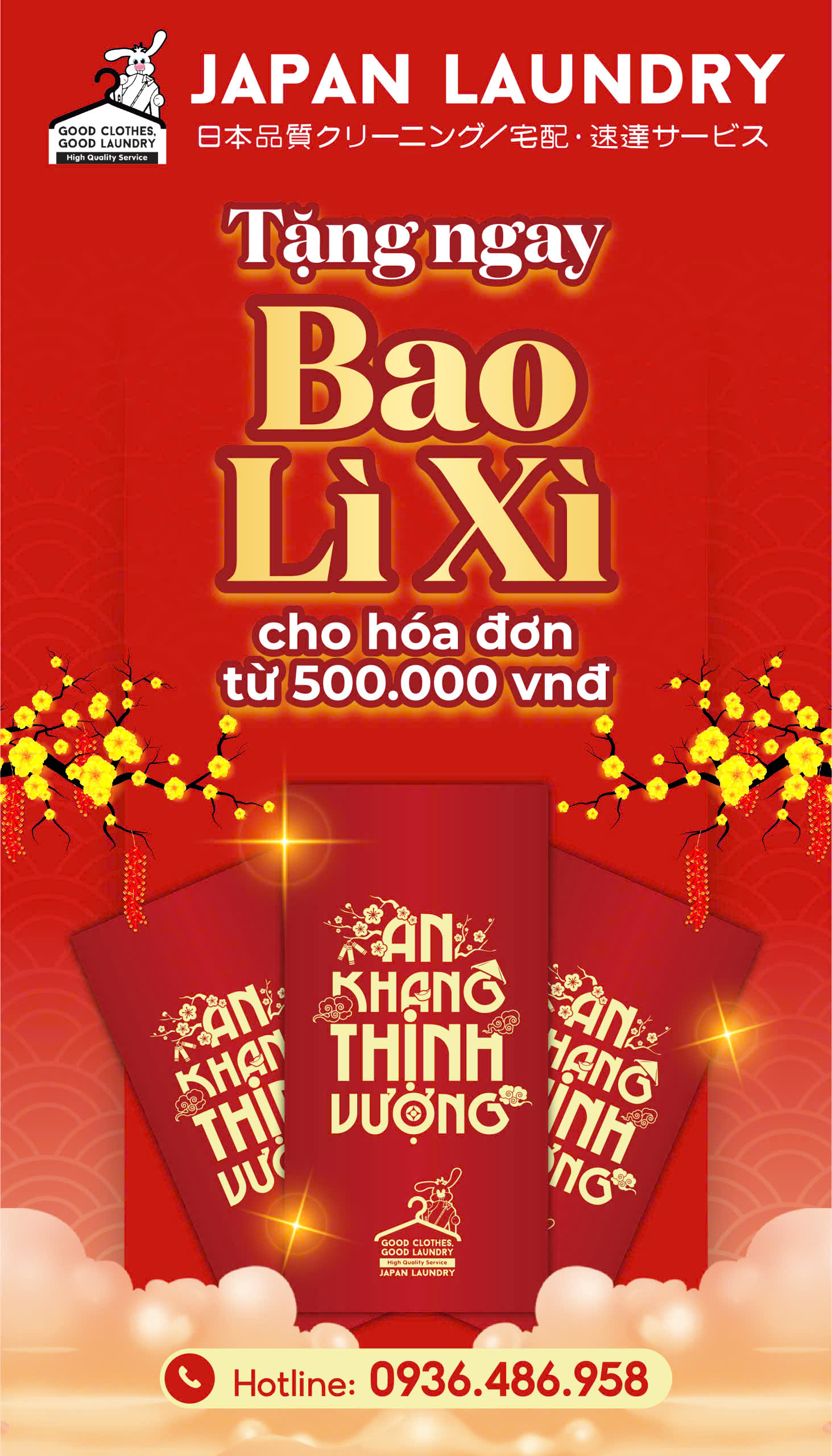 Giặt là Japan Laundry , Chúc tết may mắn , tết sum vầy , áo quần thơm tho , đong đầy tài lộc . Một năm mới Tết đến xuân sang, áo quần sạch thơm. Lì xì đỏ thắm, cả năm sung túc .