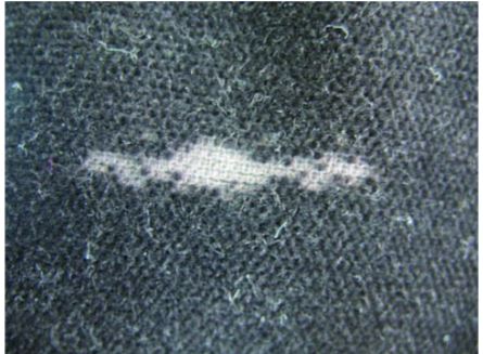 Các cọc ở hai bên gần eo trước của váy đã rơi theo hướng dệt, và vải từ quần áo có thể bị bung, lộ ra. Cọc đã rơi và vải bị lộNguyên nhân