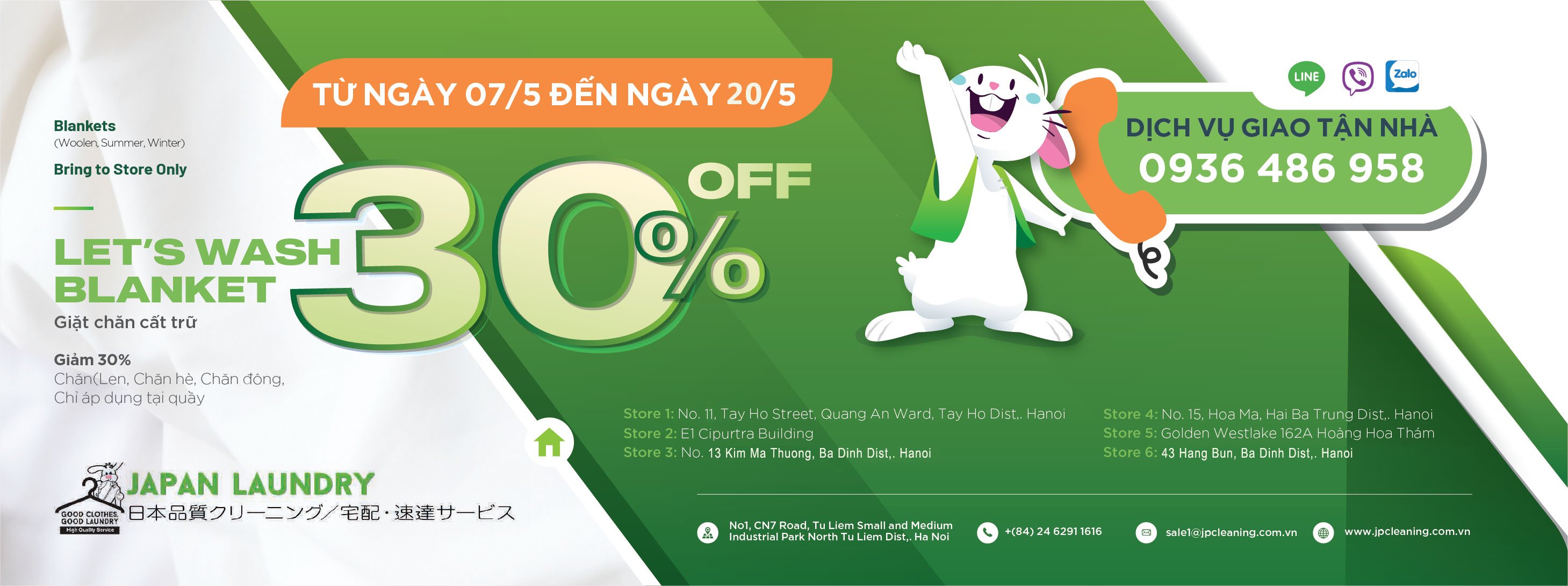 Địa điểm áp dụng: Tất cả các Store của Japan LaunDryStore 1: Số 11 đường Tây Hồ, P Quảng An, Q Tây Hồ, Hà Nội