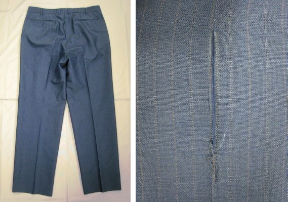Các nếp gấp gần đầu gối sau của quần bị hư hỏng hoặc trầy xước. Người dùng nghi ngờ rằng việc ấn mạnh vào thời điểm hoàn thiện có thể là nguyên nhân. Tuy nhiên, nguyên nhận thực sự là vải bị mòn dần do mặc và ép nhiều lần.