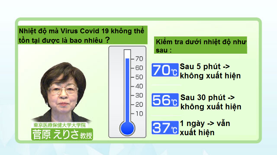 Virus Covid 19 tồn tại ở 37 độ thậm chí một ngày sau đó. Khi nhiệt độ được đặt thành 56 độ, nó không thể được phát hiện trong vòng 30 phút.