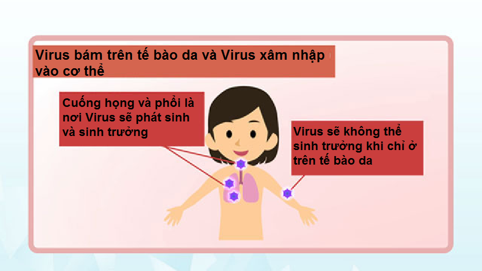 Virus Covid 19 chỉ sinh trưởng và phát tán khi đã xâm nhập vào tế bào của động vật sống, chúng chủ yếu lây nhiễm qua màng nhầy mũi, miệng và phát tán nhiều hơn trong cuống họng và phổi. Virus Covid 19 không phát tán trên tế bào da nhưng chúng sẽ không chết à nếu bạn chạm tay vào mũi, miệng sẽ có khả năng lây nhiễm cao.
