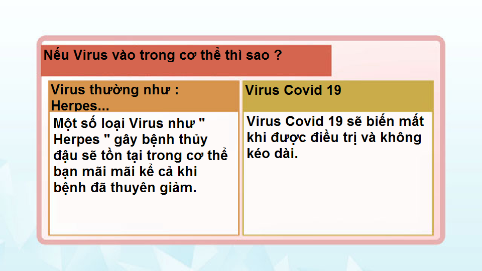 Một số loại vi rút, chẳng hạn như "vi rút herpes" gây bệnh thủy đậu, vẫn tồn tại trong cơ thể bạn mãi mãi sau khi bệnh thuyên giảm, còn Virus corona thường biến mất khi được điều trị.