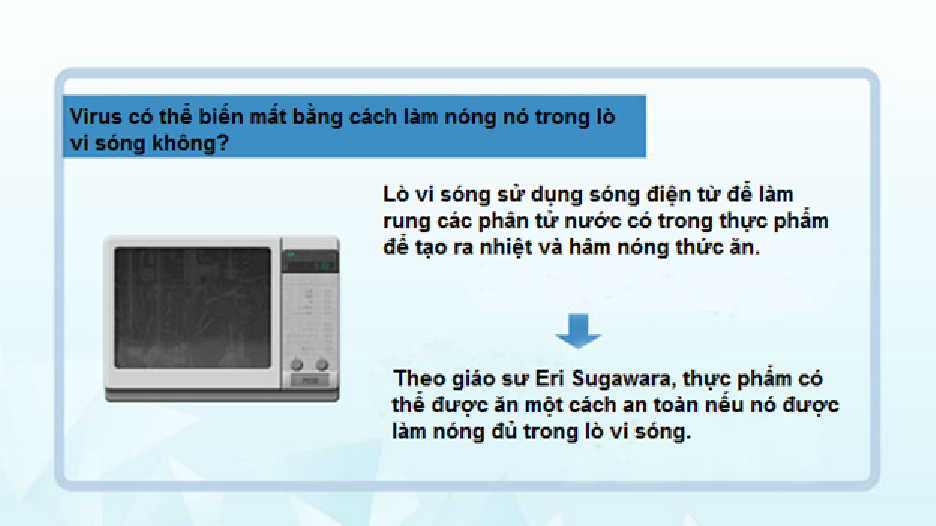 Lò vi sóng sử dụng sóng điện từ để làm rung các phân tử nước có trong thức ăn để tạo ra nhiệt và hâm nóng thức ăn. Theo Giáo sư Eri Sugawara, thực phẩm có thể được ăn một cách an toàn nếu nó được làm nóng đủ trong lò vi sóng.