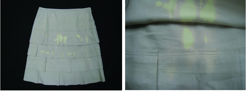 Một bên là hình ảnh tổng quan của chiếc váy bị biến màu, 1 bên là hình ảnh chi tiết vết bạc màu. Bạn nhìn thấy rõ không?