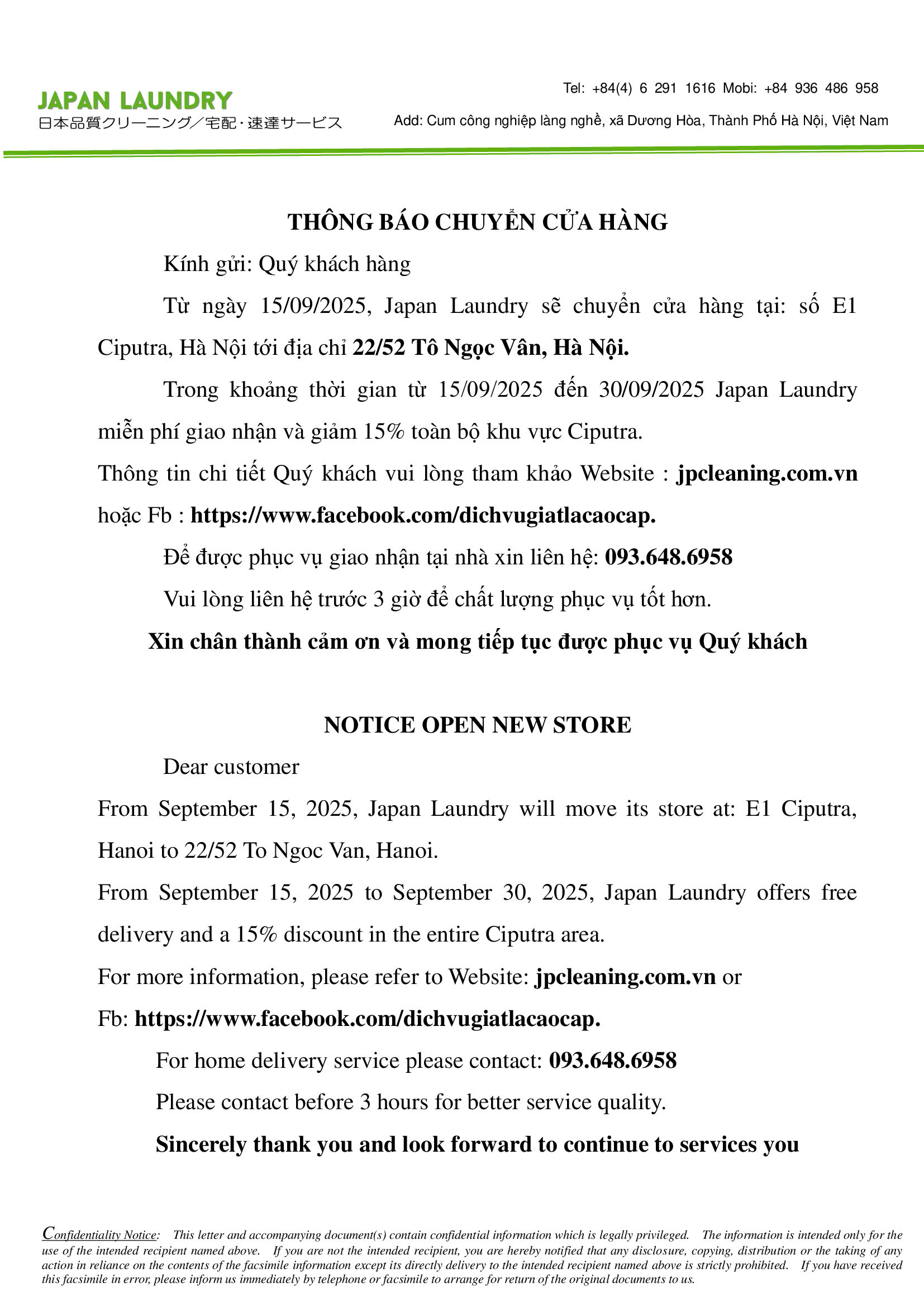 From September 15, 2025, Japan Laundry will move its store at: E1 Ciputra, Hanoi to 22/52 To Ngoc Van, Hanoi.