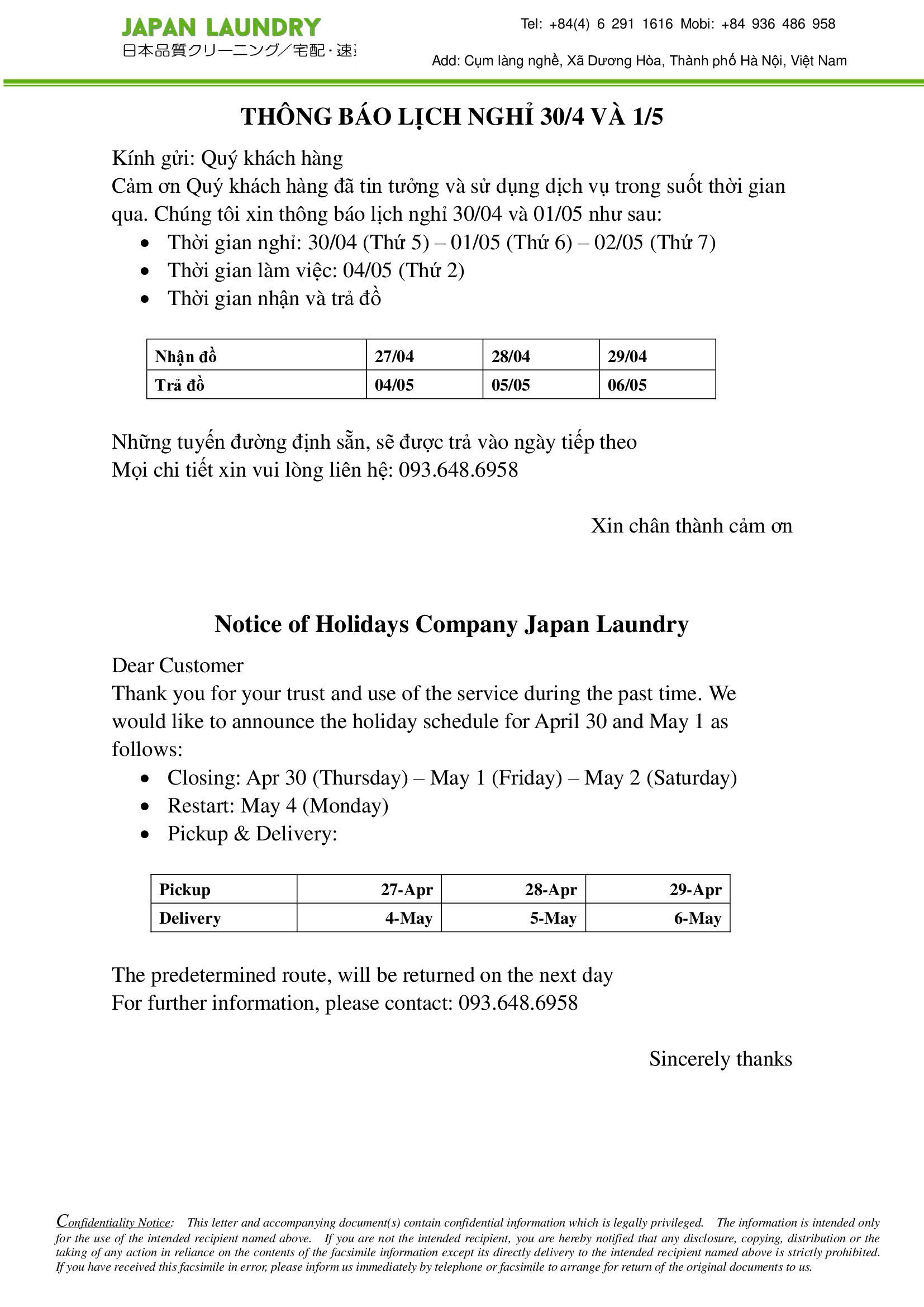 Cảm ơn Quý khách hàng đã tin tưởng và sử dụng dịch vụ trong suốt thời gian qua. Chúng tôi xin thông báo lịch nghỉ 30/04 và 01/05 như sau:
