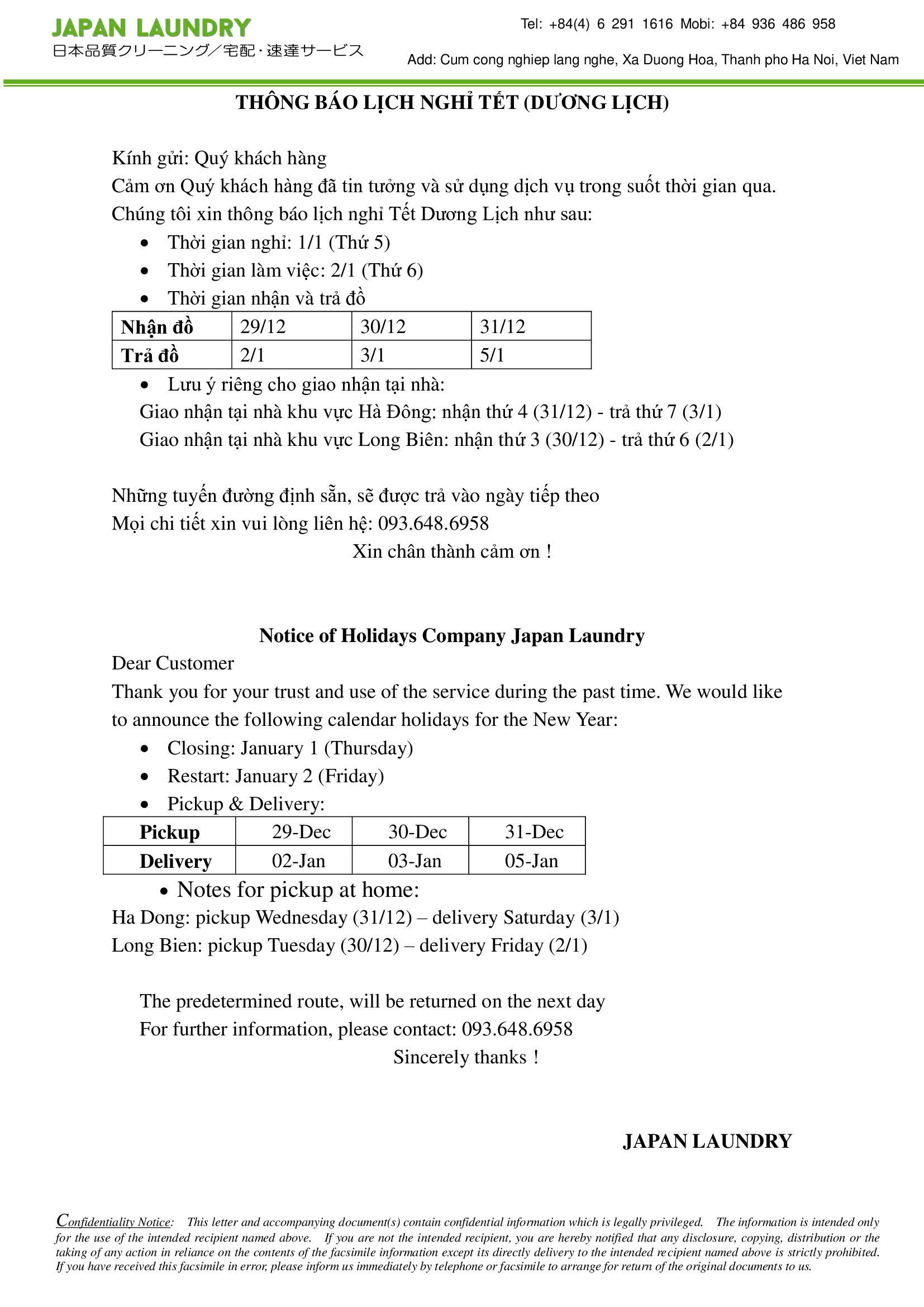 Cảm ơn Quý khách hàng đã tin tưởng và sử dụng dịch vụ trong suốt thời gian qua. Chúng tôi xin thông báo lịch nghỉ Tết Dương Lịch như sau:
