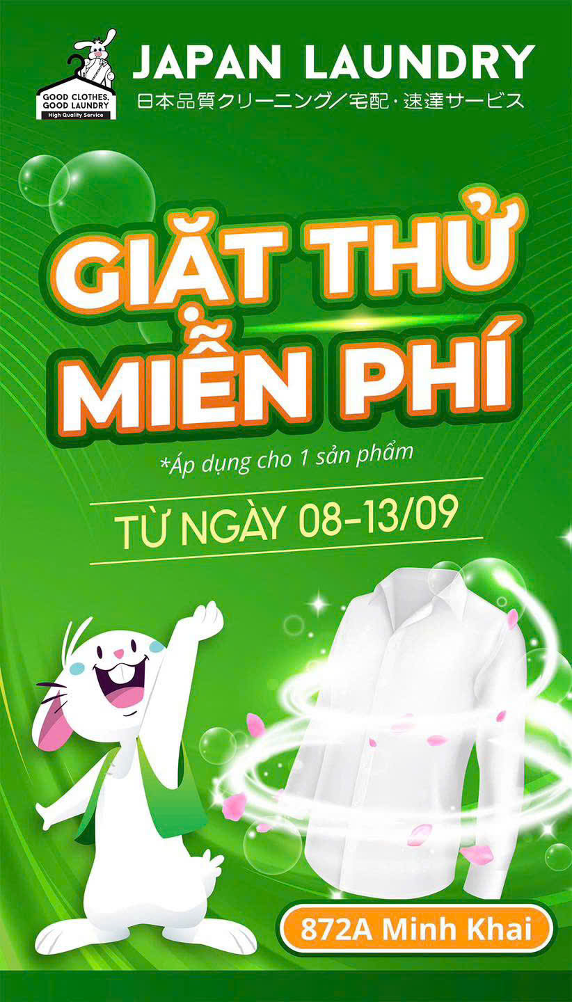 MIỄN PHÍ đồ giặt đầu tiên dành cho khách hàng mới khi đến tại cửa hàng Japan Laundry 872A Minh Khai từ ngày 8-13/9
