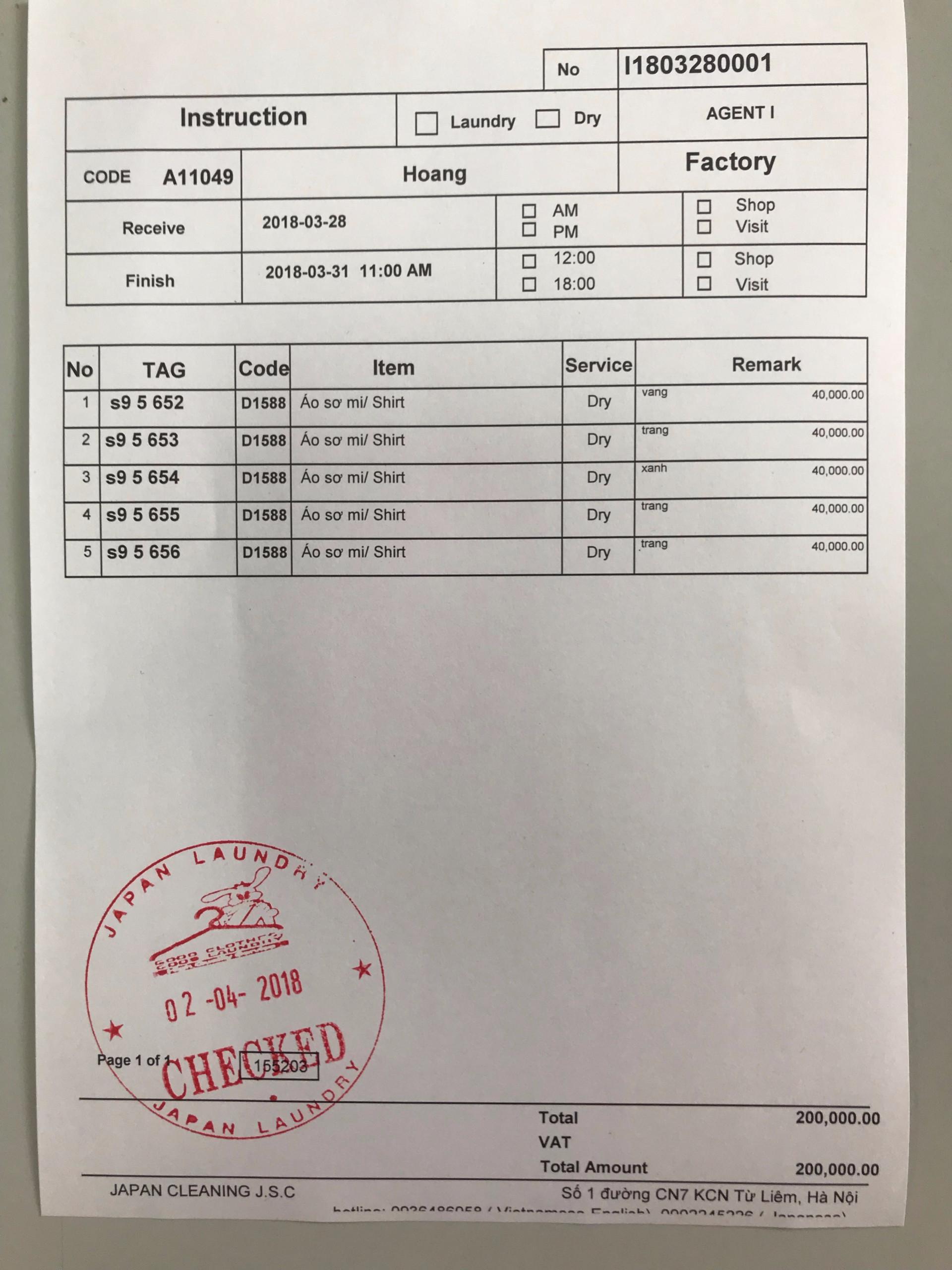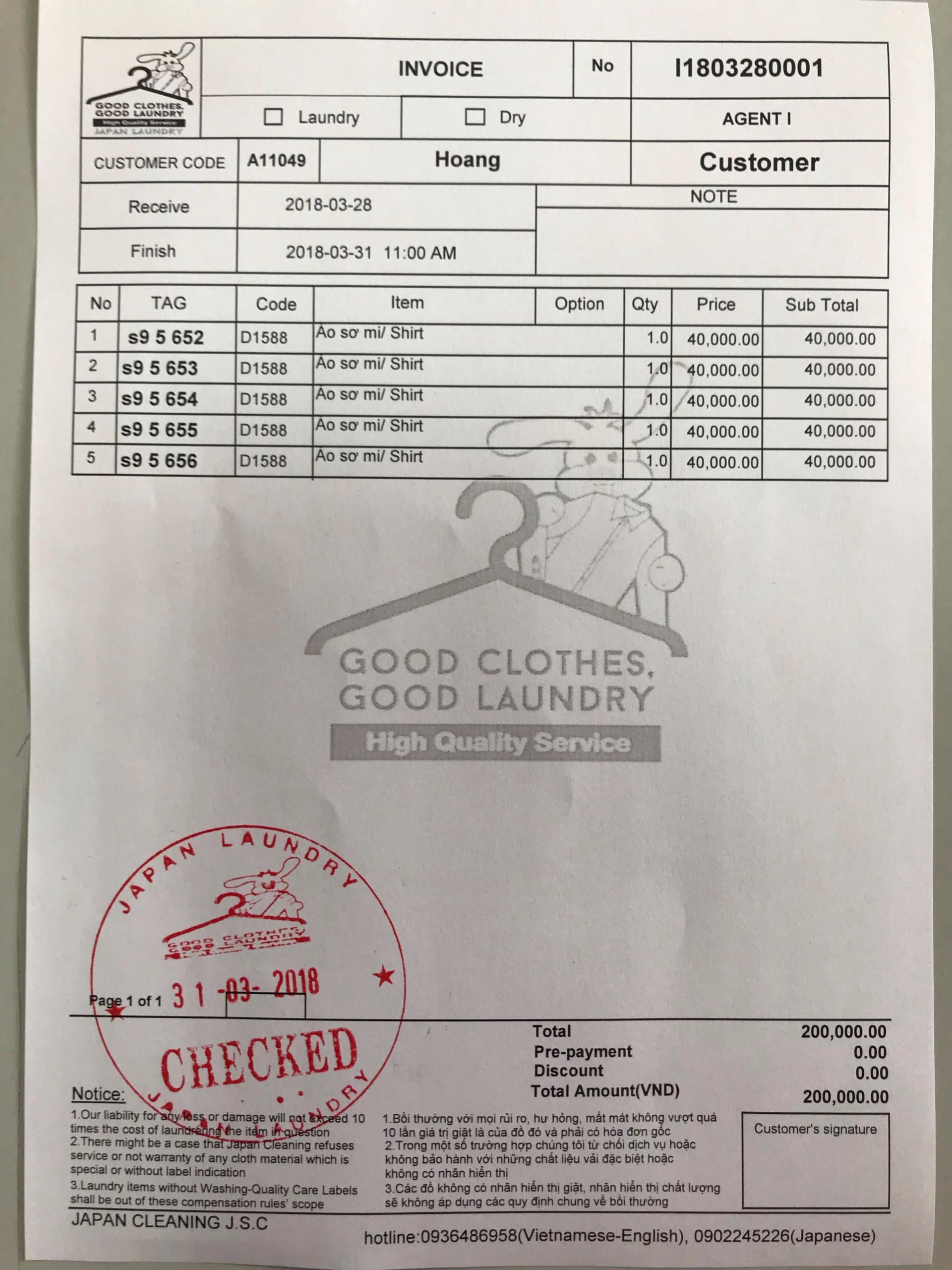 Trên invoice đưa khách sẽ có logo con thỏ in mờ và có con dấu của bộ phận xuất hàng bên Japan Laundry