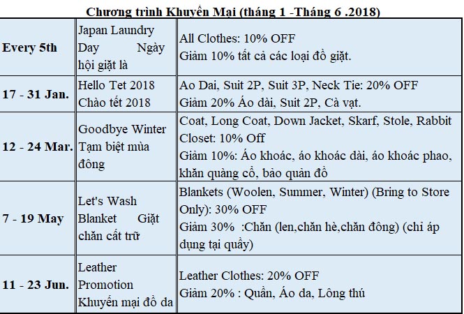 Japan Laundry hiện đang là đơn vị cung cấp dịch vụ giặt là tiên phong trong việc ứng dụng các công nghệ mới, các kỹ thuật hiện đại trên thế giới về giặt đồ ở Việt Nam. Chúng tôi luôn hiểu rằng những bước đi ban đầu chắc chắn sẽ gặp nhiều khó khăn nhưng ban lãnh đạo công ty luôn hướng tới phương châm cao nhất đó là mang lại giá trị cho khách hàng. Và minh chứng rõ nhất đó chính là thông qua chất lương dịch vụ và giá cả phải chăng. Dưới đây là tổng hợp các khuyến mãi trong 6 tháng đầu năm 2018 để quý khách hàng tiện theo dõi và có kế hoạch riêng cho mình.